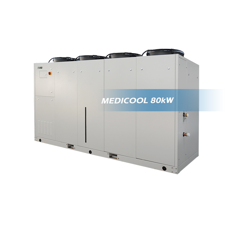 MEDICOOL air-cooled chiller is designed and manufactured to provide chilled water (coolant) for MRI, CT and other large medical equipment. MEDICOOL meet the requirement of 24X7 continuous operation thanks to its two fully independent refrigeration circuits, highly reliable components and intelligent control system.